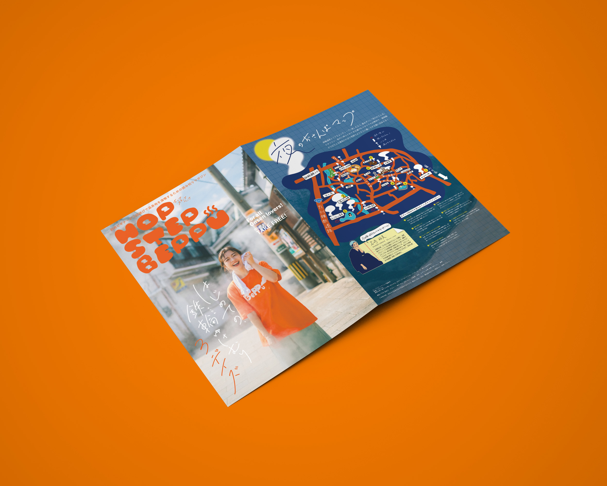 ターゲットとする年齢層は20代〜30代になります。クライアントから若年層に向けた感じにしてほしいとのことでしたので、全体的にカラフルな印象にしました。手書きフォントなども入れ親しみやすさを取り入れてます。裏面のイラストは、夜のイメージができるように背景の写真のトーンを落としたり、月夜をイメージできるイラストを描きました。