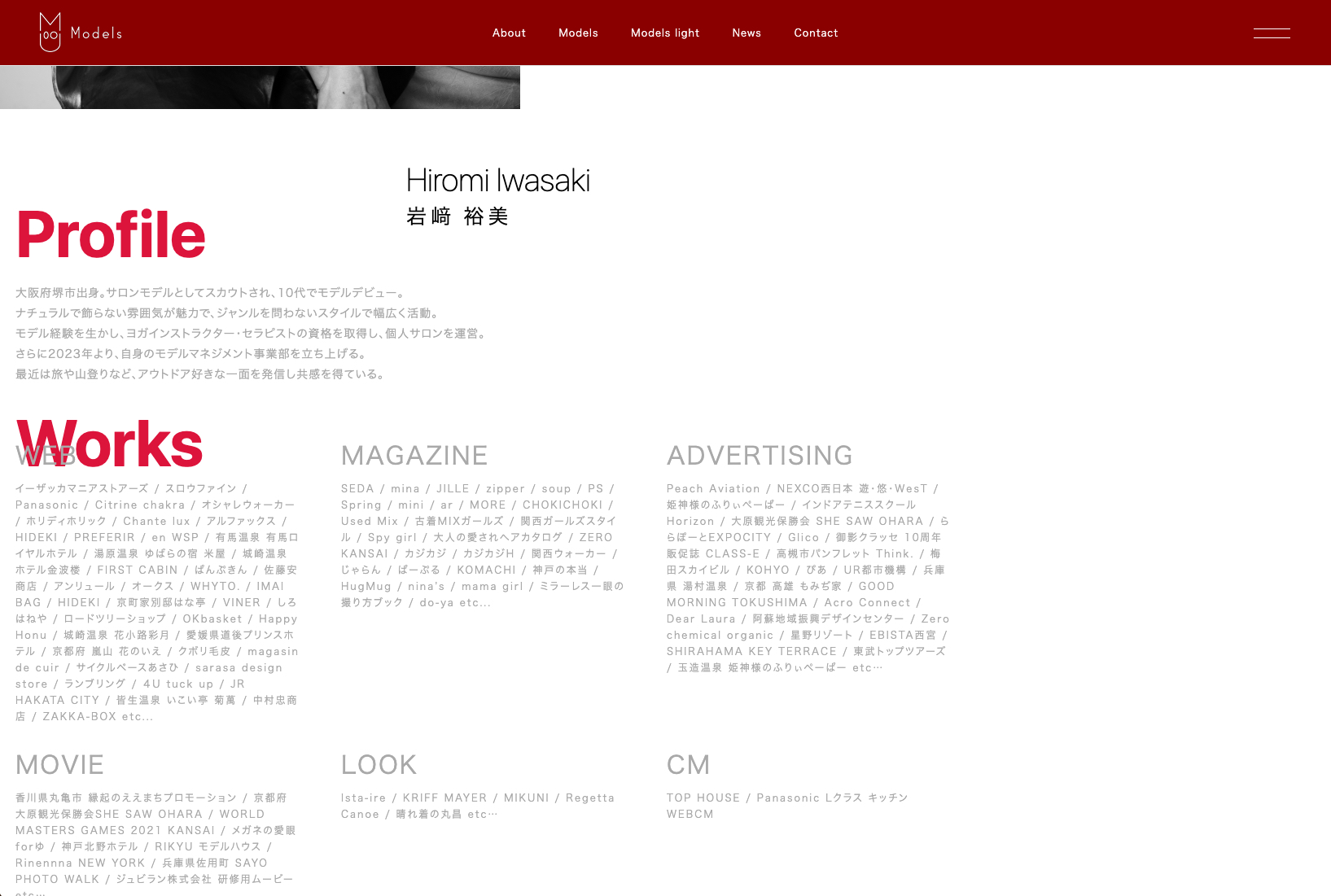 前職で勤めていた大阪のクリエイティブ・スタジオ「株式会社MU」のモデル事務所のHPを制作しました。モデルの雰囲気を分かりやすく伝えつつも、マネージャーの思いなどを中心にデザインしました。