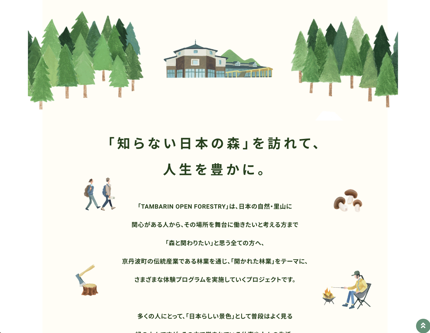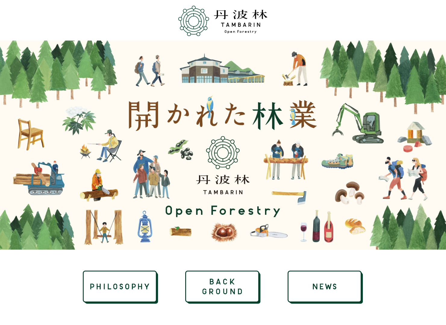 TAMBARIN-Open Forestryのサイトは、京丹波町の森林や林業をテーマに、視覚的なデザインが特徴です。イラストを中心にデザインされており、様々な事業を掲載しています。