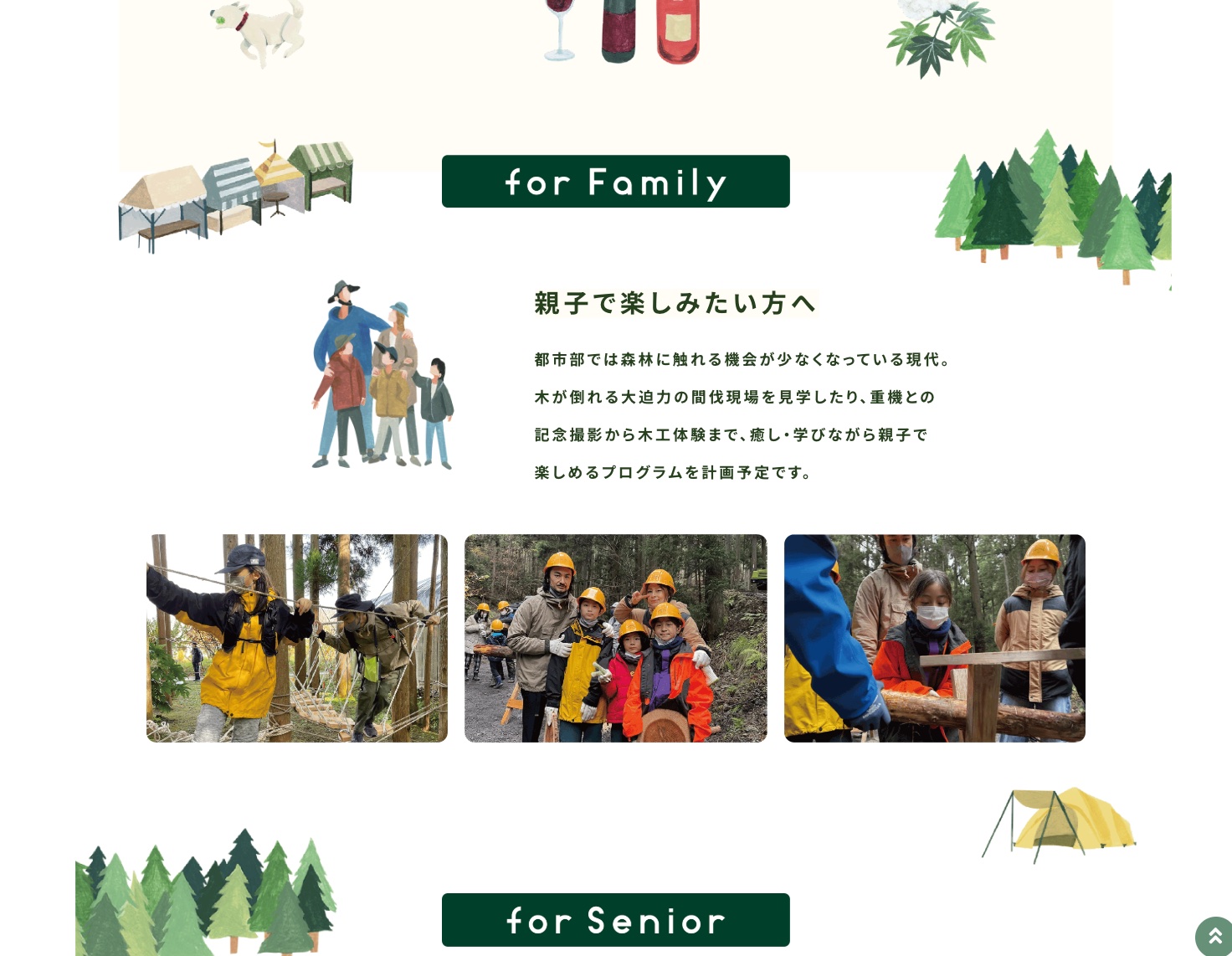 ターゲットとする年齢層は20代〜40代になります。クライアントから親しみやすさを感じるようにしてほしいとのことでしたので、イラストレーターからいただいた素材を活かすために、所々にイラストを配置しました。木々や自然の魅力が直感的に伝わる設計をしています。