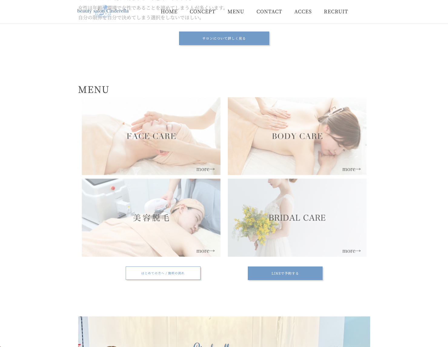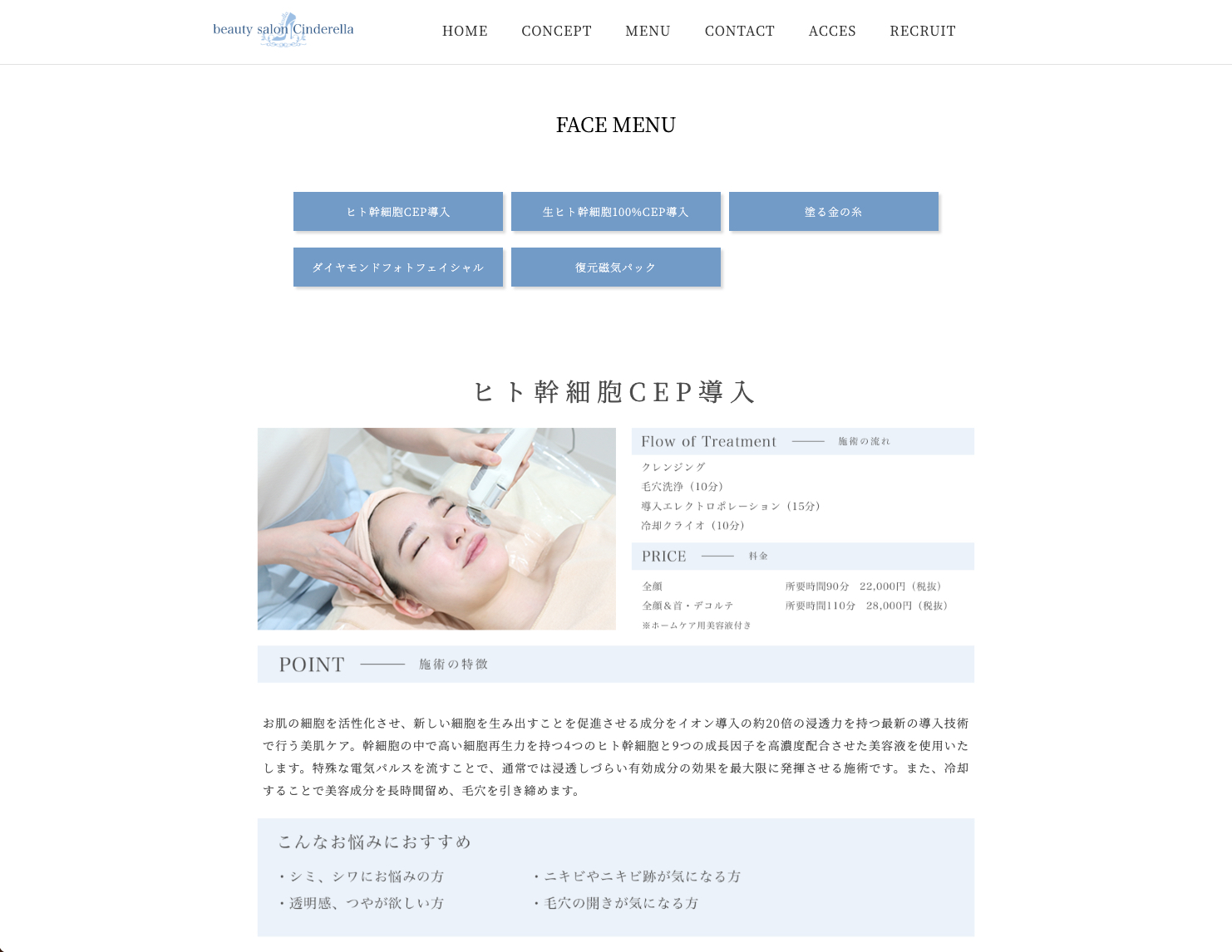 このサイトは、大阪・心斎橋に店舗を構えるエステサロンです。HIFUフェイシャルやモナスパ、エイジングケアなど多様なメニューを提供し、メニューなどをユーザーに分かりやすくデザインしています。